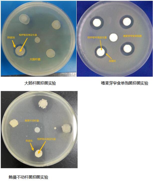 为了进一步研究悦呼吸环境益生菌对常见致病菌的抑制效果,悦呼吸研发团队重新进行了抑菌实验,对嗜麦芽窄食单孢菌、鲍曼不动杆菌等条件致病菌进行了探究。