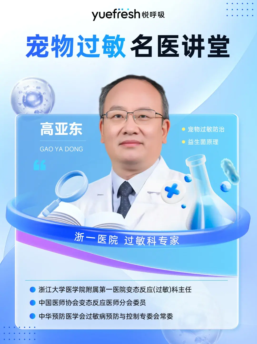 悦呼吸宠物过敏名医讲堂第四期,我们邀请到了浙大一院变态反应(过敏)科高亚东主任。高主任从宠物过敏概述,宠物过敏原与症状,宠物过敏的诊断等方面展开分享,重点讲解了我们该如何进行宠物过敏防治。